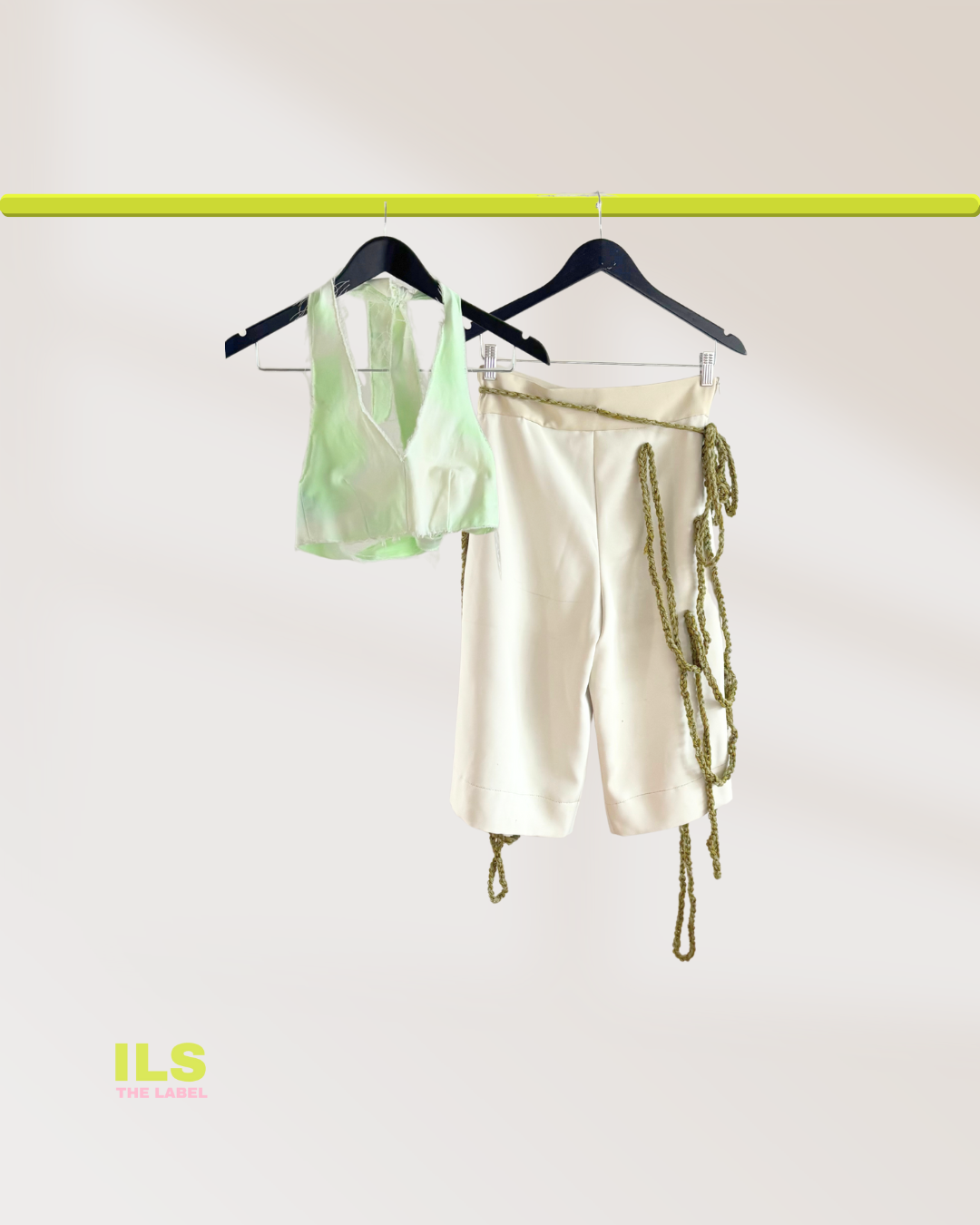 ETM N.03 combines thoughtful design with responsible material sourcing. The denim top showcases classic construction, while the pants feature a distinctive upcycled element—crafted from reclaimed curtain fabric. This pairing demonstrates how sustainable practices and creative repurposing can yield distinctive, wearable pieces. Each garment reflects a commitment to reducing textile waste while maintaining quality and style.