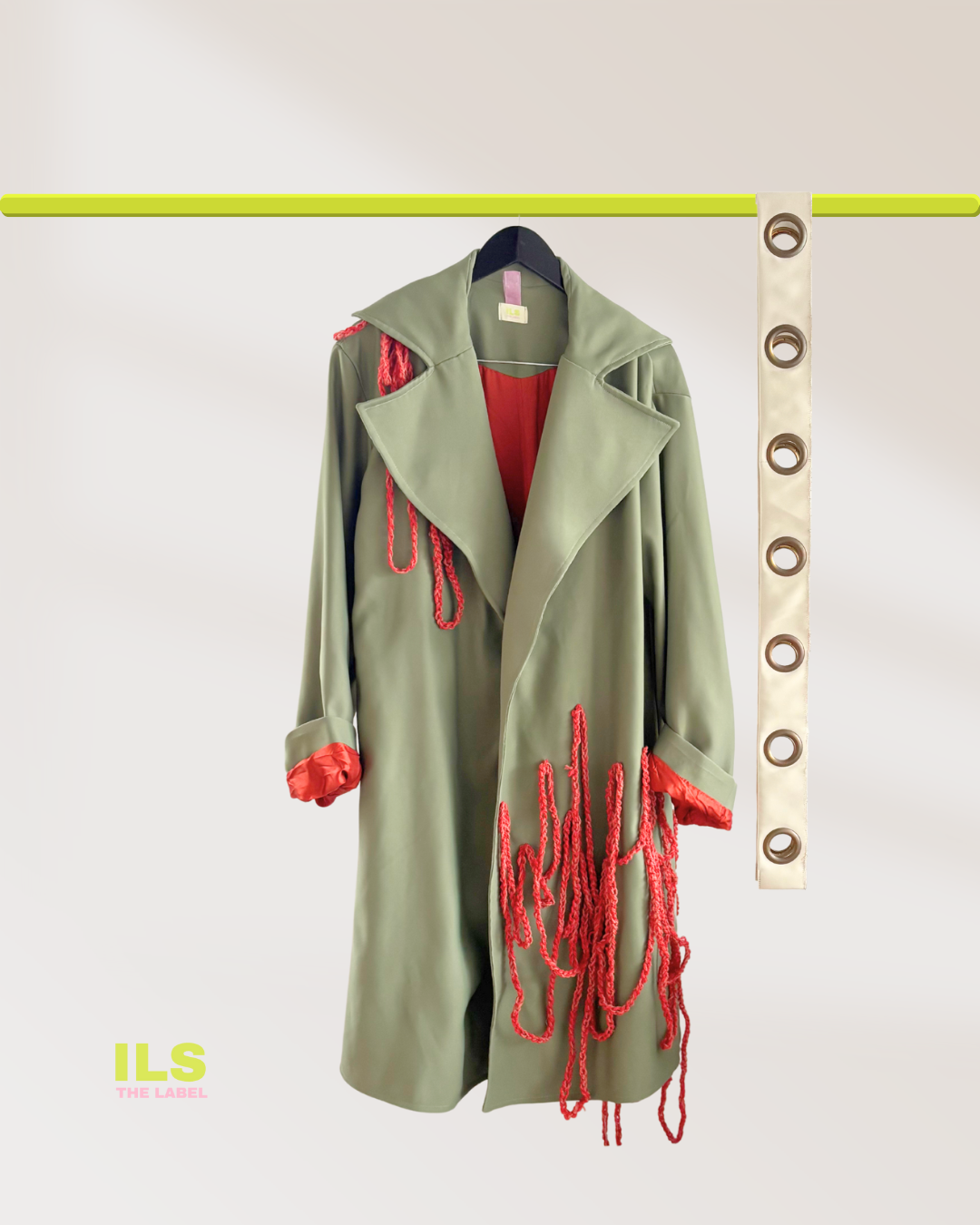 This distinctive trenchcoat exemplifies thoughtful upcycling, transforming vintage curtain fabric into a refined outerwear piece. The structured silhouette maintains classic trench proportions while the repurposed textile foundation carries its own narrative of sustainability. Embellished with reclaimed wool accents, each detail reinforces the garment's commitment to circular design. A statement piece for those who value craftsmanship and environmental consciousness, ETM N.04 merges timeless tailoring with contemporary values.